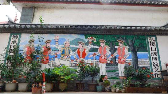 方正的堂屋里掛滿了何松康參加演出、培訓(xùn)的各種照片及霸王鞭、八角鼓、服裝等演出道具。院子的墻上專門請人繪了一幅霸王鞭的彩繪,旁邊書寫:“弘揚(yáng)白族傳統(tǒng)文化,傳承民間舞蹈藝術(shù)”。