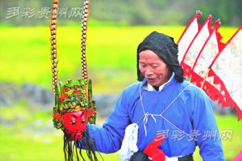 安順地戲的顯著特點(diǎn)是演出者頭蒙青巾,腰圍戰(zhàn)裙,戴假面于額前,手執(zhí)戈矛刀戟之屬,隨口而唱,應(yīng)聲而舞。