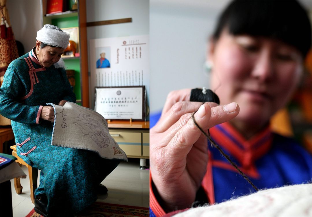蒙古包穹頂?shù)絻?nèi)壁,從門簾到地上鋪的毛氈,從日常家居的蓋布到商旅使用的茶鹽袋,蒙古族人將細(xì)膩的各式花樣運用在食衣住行的各個方面。而這些精美絕倫的裝飾都有一個共同的名字,那就是蒙古族氈繡技藝。