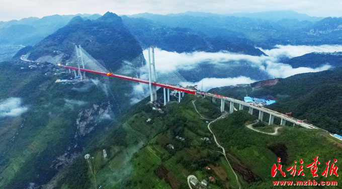 我國(guó)東西橫線(xiàn)大通道杭瑞國(guó)家高速公路的關(guān)鍵節(jié)點(diǎn)——畢節(jié)至都格高速公路北盤(pán)江大橋。該橋橋面到谷底垂直高度達(dá)569.66米,為世界第一高(鄧剛 攝影)