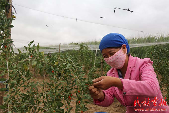 楊彩梅的二兒媳在摘枸杞,這里種植枸杞是農(nóng)戶(hù)增收的一大來(lái)源(曾穎 攝影)