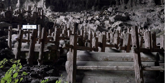 果里巖洞葬位于貴州龍里縣擺省鄉(xiāng)果里村東1公里煤洞坡的洞穴中,地處巖溶山原,峰叢林立,喬灌間雜。該洞在山頂下四十米處呈南北向橫穿山體,長580米,寬為38—65米,高為21—50米,有兩個入口;北面入口,寬54米,高21米,;南面入口,寬35米,高45米,有三道石砌墻垣。洞中地勢內(nèi)斜平緩,洞內(nèi)干燥,能見度好,入口處地勢外斜。據(jù)查,果里的苗族于明朝初期從貴陽遷徙而來。從遷徙之初至清末,他們均習(xí)慣將亡者殮于棺木集中存放在洞穴之內(nèi)。在洞穴北面入口3000平方米的范圍內(nèi)現(xiàn)存完好的棺木有192具,腐朽散落及其它原因損毀的約200余具。棺木材質(zhì)為杉木。棺木有平板平頭和鼓型雄頭之分,其大小因亡者的體型而定。平板平頭型棺木制作粗糙,長1.45—2.23米,寬0.46—0.75米,高0.46——0.9米;鼓型雄頭棺木多為杉木本色,長1.5—2.23米,寬0.48—0.8米,高0.5—0.9米。棺木一律頭向北面入口,均固定于兩個或三個“井”字架上;三個“井”字架表明亡者為男性,兩個“井”字架的為女性。棺內(nèi)亡者頭靠凹型木枕。平板平頭棺為明代,鼓型雄頭棺為清代。