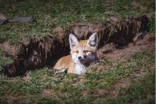 睡眼惺忪的小赤狐晃悠著小腦袋走出洞口,東望望西瞧瞧。判斷出周圍沒有危險,它便爬出了洞口,在草地上長長地伸了一個懶腰。