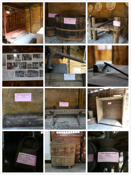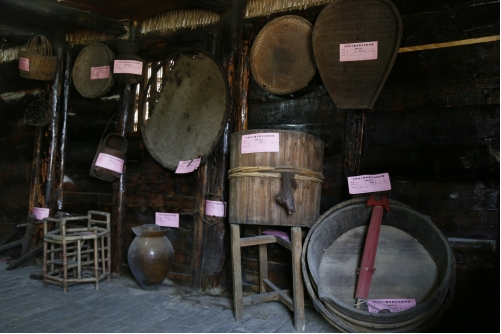 “農(nóng)耕文化陳列館”是由兩棟傳統(tǒng)的木質(zhì)民房改建,從大門進(jìn)來,門的兩邊放置有農(nóng)具,右側(cè)一個是存儲糧食的倉庫,沿著倉庫邊上的石階往上走,從小門進(jìn)去,大大小小的簸箕、飯甑、貓籮、魚籮等農(nóng)具應(yīng)有盡有。