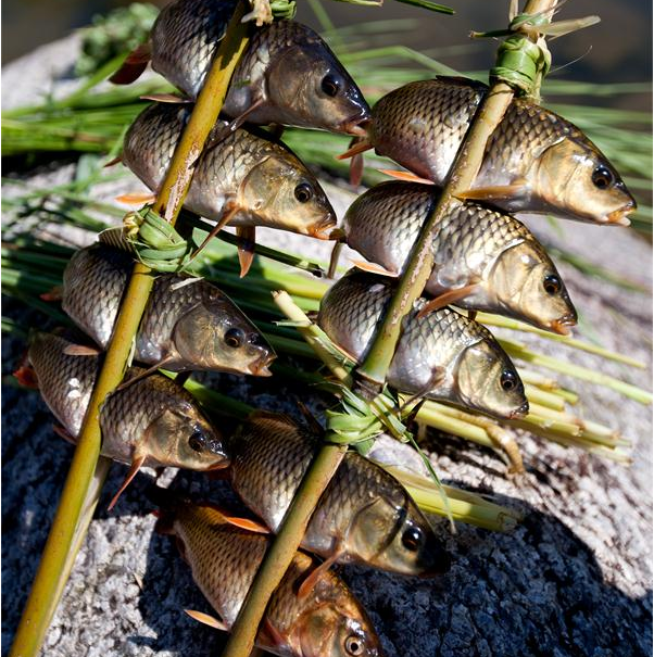 燒魚是廣西融水苗胞的習(xí)俗之一,融水的苗族同胞素有在稻田里養(yǎng)魚的習(xí)慣,每年春插,苗家人向來喜歡在稻田里放養(yǎng)鯉魚。每年的秋收稻黃時節(jié)也是田鯉肥壯之時,這時來自四鄉(xiāng)八寨眾多的各民族兄弟便匯聚起來,點燃一堆堆篝火,燒田鯉吃野餐,盡享豐收喜悅。燒魚從9月稻黃收割開始持續(xù)到12月底才正式結(jié)束,故名“元寶山金秋燒魚季”。燒魚季節(jié),苗寨家家戶戶釀起醇濃的甜酒,蒸著香噴噴的糯米飯,帶上食鹽、辣椒、蒜苗、蔥花、薄荷等佐料上山去剪禾。晌午時候,他們在田頭或田邊的平地?zé)鹨欢讯洋艋?,從田里抓來一籠籠活蹦亂跳的鯉魚,用樹枝或竹片把魚一條條串起,排成一排,然后放在紅彤彤的火炭上翻來覆去地烤,大約半小時左右,魚被烤炙得“呲呲”作響,水分烤干,慢慢地變黃,直至熟透,香飄四溢,遠(yuǎn)遠(yuǎn)就可聞到香味。