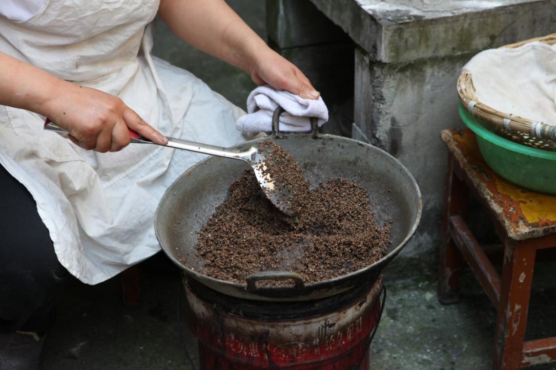 清明粑餡心的原材料,包含百分之五十的蘇麻、百分之三十的花生、剩余部分是白芝麻、玫瑰糖和白糖,加工過(guò)程頗為繁瑣。黃家英將白芝麻、花生、蘇麻洗凈后,分別放入鐵鍋中翻炒,小火防止局部焦糊,不斷翻炒使得每一顆都能受熱均勻。