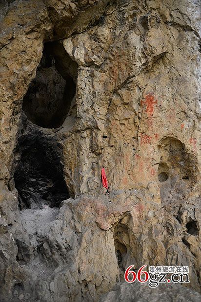 據(jù)資料載,金山洞古代崖畫以赭色涂繪人、馬、狗等等,隱約可見形態(tài)各異的大小圖像二三十個。人物多作行走狀,亦有雙手高舉者,似乎在祈禱。從其畫風(fēng)觀察,與相距不遠(yuǎn)的省級文物保護(hù)單位--長順龍家院崖畫十分相似。