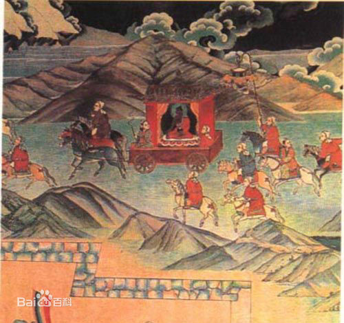 貞觀15年(641)正月十五,唐太宗將文成公主下嫁松贊干布,詔令江夏王李道宗持節(jié)護(hù)送。文成公主在唐送親使江夏王太宗族弟李道宗和吐蕃迎親專使祿東贊的伴隨下,前往吐蕃。文成公主一行從長(zhǎng)安出發(fā),途經(jīng)西寧,翻日月山,長(zhǎng)途跋涉到達(dá)拉薩。 松贊干布率群臣到河源附近的柏海(今青?,敹嗫h境內(nèi))迎接文成公主,謁見李道宗,行子婿之禮。之后與公主同返邏些(今拉薩),為公主筑城、修建宮室。