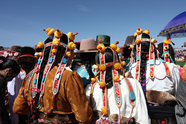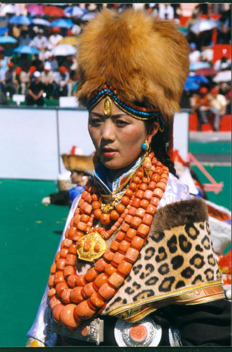 藏族婦女發(fā)飾因地域之別而顯得豐富多彩。西藏部分地方的婦女喜戴巴珠,拉薩附近的婦女所戴三角形巴珠,平系與頭頂,兩枝向前,將分梳的兩條發(fā)辮分別盤(pán)在兩枝上。日喀則、江孜一帶的婦女戴弓形巴珠,弓背向上,梳成多條的發(fā)辮分別掛在弓的兩端。貴重的巴珠上面鑲有珊瑚、瑪瑙等,顯得富麗堂皇。姑娘一戴巴珠,就意為著長(zhǎng)大成人,因此,第一次戴巴珠時(shí),家中要為姑娘舉行傳統(tǒng)的成人儀式。
