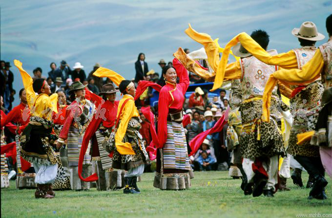 到17世紀(jì)中葉,“雪頓”活動內(nèi)容更加豐富,已開始演出藏戲,并以哲蚌寺為活動中心開展活動,故又稱之為“哲蚌雪頓”,從此便形成了固定的雪頓節(jié)。五世達(dá)賴羅桑嘉措從哲蚌寺移居布達(dá)拉宮后,每年藏歷六月三十日,首先在哲蚌寺舉行藏戲匯演,次日則必須赴布達(dá)拉宮演出。18世紀(jì)下半葉羅布林卡(寶貝圓林)建成,達(dá)賴?yán)镆凭恿_布林卡,雪頓節(jié)的活動又從布達(dá)拉宮轉(zhuǎn)移到羅布林卡。每年藏歷七月一日,由拉薩、日喀則、窮吉、雅礱、堆龍德慶、尼木等地的藏劇團(tuán),6個(gè)“扎西雪巴”(藏戲的一種)戲班子,一個(gè)牦牛舞班子和一個(gè)“卓巴”(打鼓舞隊(duì)),在羅布林卡進(jìn)行聯(lián)合演出。屆時(shí),噶廈政府機(jī)關(guān)放假,全體官員要集中到羅布林卡陪同達(dá)賴?yán)镉^看藏戲,中午噶廈政府要專門設(shè)宴招待全體官員,席間不能缺少酸奶,以示對節(jié)日由來的紀(jì)念。在此期間,允許拉薩市民及附近藏族群眾進(jìn)入羅布林卡觀看藏戲演出,這便逐漸形成了一整套固定的節(jié)日儀式。雪頓節(jié)經(jīng)過了300多年的發(fā)展歷史,從宗教節(jié)日演化為藏戲藝術(shù)節(jié)。故此,現(xiàn)代人把雪頓節(jié)稱之為“藏戲節(jié)”。