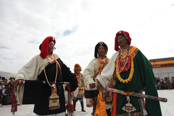 藏族分布在全國五省區(qū),因氣候、環(huán)境的不同,形成了豐富多彩的服飾文化。藏族服飾有“隔山兩個樣的”說法,有人統(tǒng)計,因地域、男女、年齡、婚否和季節(jié)的不同,藏族服飾有100多種。男裝各地大同小異,上身穿寬大的藏袍,袖長及膝。束各種腰帶。寬大的藏袍非常適應(yīng)青藏高原多變的氣候,露出右臂便于勞作,天熱時將脫掉兩袖,將藏袍扎在腰間,天冷時套上雙袖。西藏人的服飾樣式很多,有衛(wèi)藏類服飾、康巴類服飾、安多類服飾和拉薩裝。衛(wèi)藏主要指除昌都地區(qū)以外的西藏大部分地區(qū)。西藏大部分地區(qū)的男裝,主要衣料是氆氌,城鎮(zhèn)人多穿黑色,農(nóng)牧民多穿白色。康巴主要指西藏的昌都和青海的玉樹、果洛一帶。男子多內(nèi)穿右襟齊臍短襖,外罩圓領(lǐng)寬袖長袍。頭戴狐皮帽或“扎秀”(發(fā)辮纏紅絲線),扎腳穿高筒靴顯得英俊瀟灑。女子穿長袖衫,外罩坎肩,腰束彩條圍裙。講究腰帶和腰刀,腰帶和腰刀上要鑲嵌金銀珠寶。女子多戴名貴飾品,顯得華麗昂貴。安多藏區(qū)主要指西藏那曲與安多縣接壤的地方。過去,男裝衣領(lǐng)、袖口,下擺多飾虎豹皮,女裝邊飾多為水獺皮,而且項、腕、手指和腰間配有金銀寶石飾物。