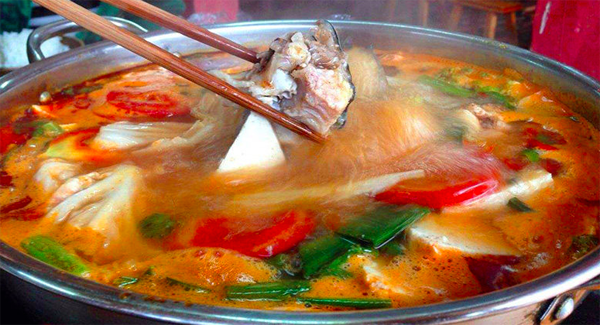 一、用魚醬烹調(diào)的酸湯魚在永樂當(dāng)?shù)厥窍喈?dāng)盛行的;因為烹調(diào)佳品魚醬在永樂當(dāng)?shù)叵喈?dāng)普遍,用它烹調(diào)出來的酸湯魚的味道是麻、辣、酸、鮮五味俱全,也是苗鄉(xiāng)一道有名的火鍋。